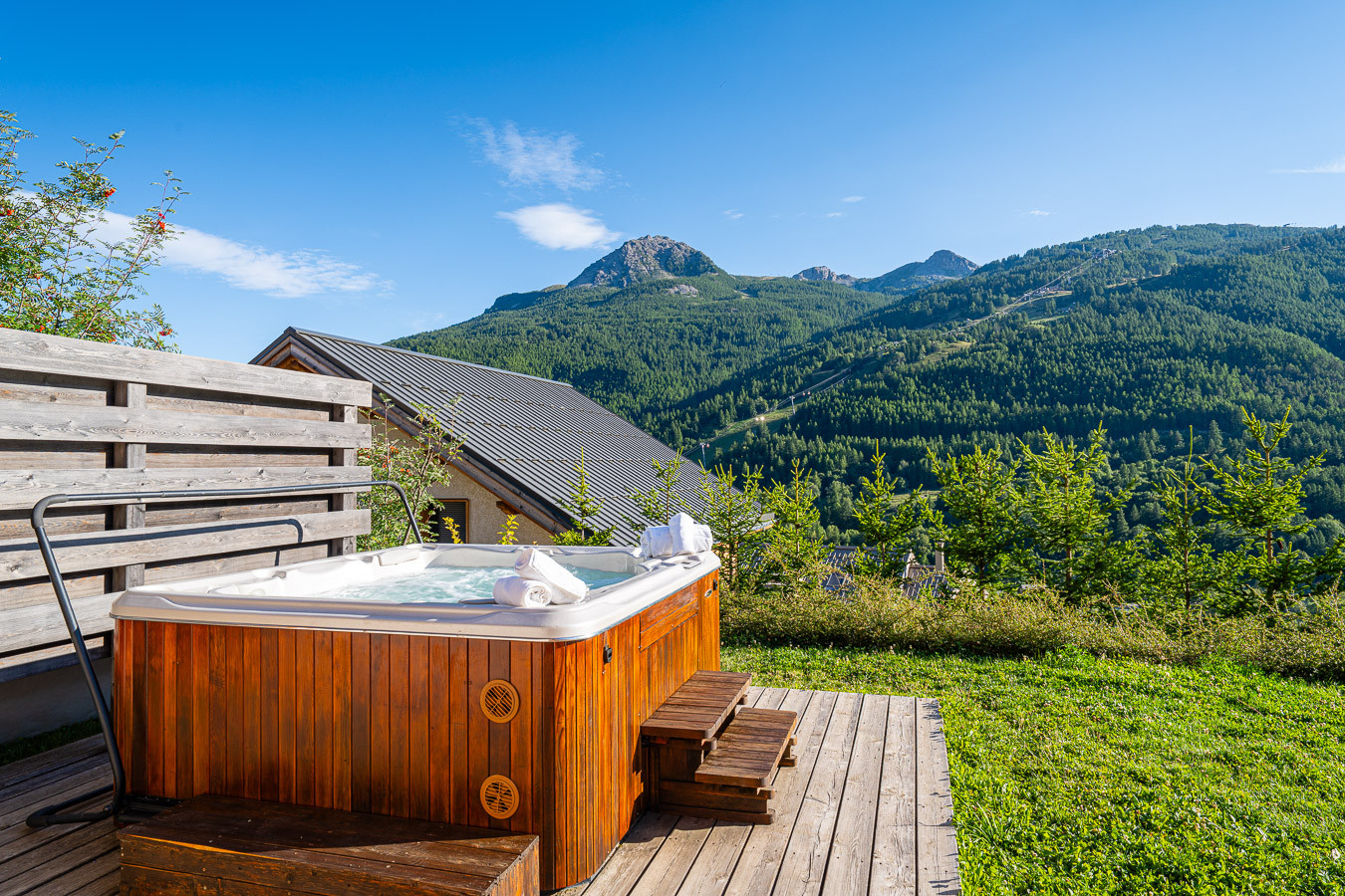 Ce logement de charme bénéficie de sa vaste terrasse de 250m2, d’une magnifique vue à 180° sur toute la vallée de Briançon à Monêtier-les-Bains, il fait face à la célèbre piste Luc Alphand.